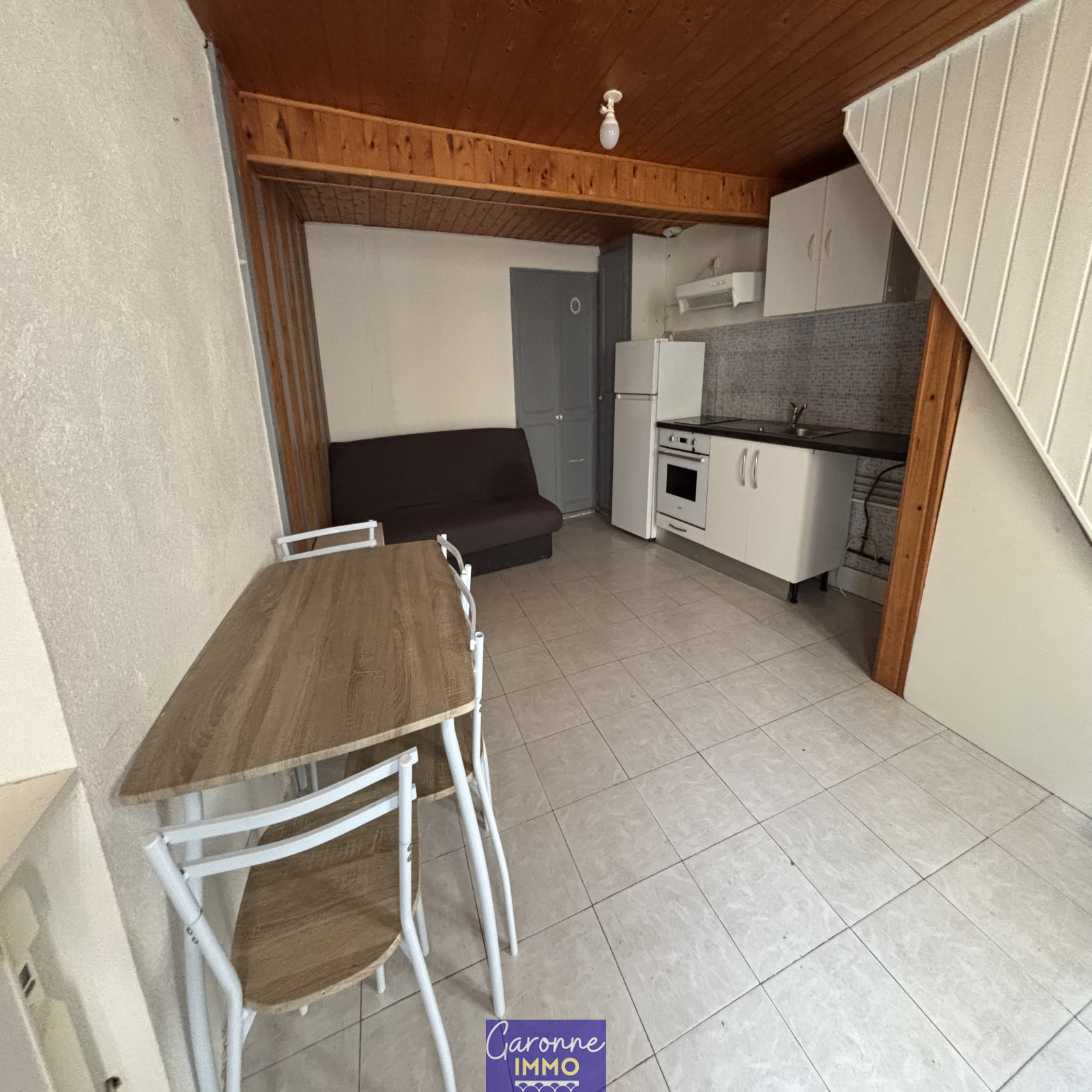 Maison mitoyenne des 2 côtés, comprenant au rdc une pièce de vie avec cuisine ouverte (hotte, plaque, four et frigo), au 1er étage un salon, salle d'eau avec WC et au R+2 la chambre.