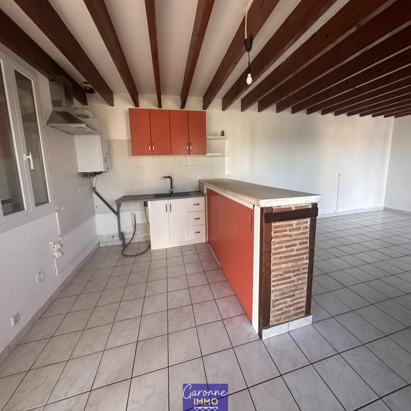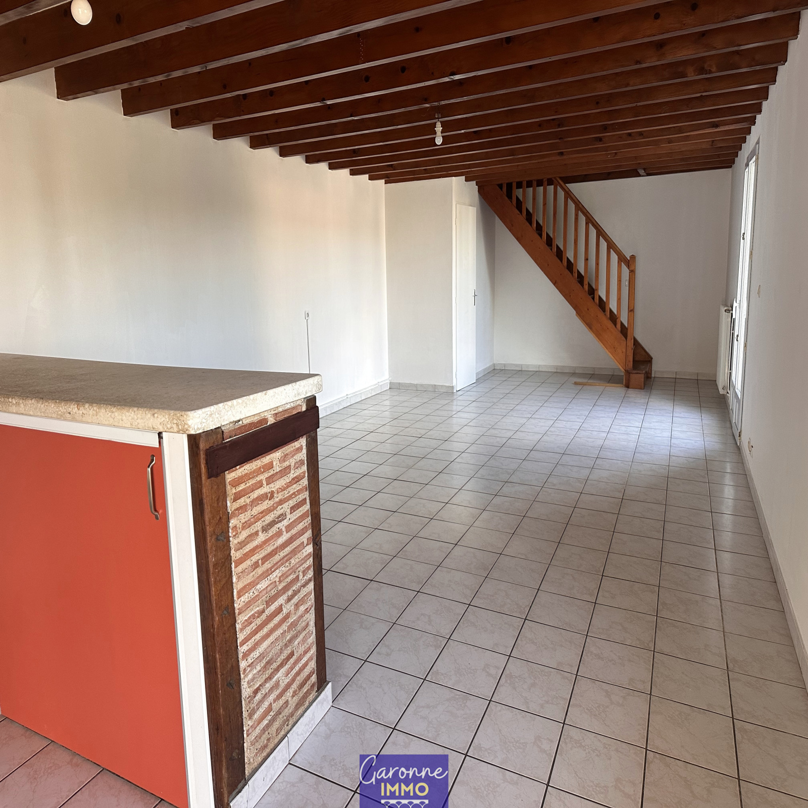 Maison T4 mitoyenne d'un côté de 95m² comprenant une entrée, une cuisine équipée ouverte sur un salon/séjour, un WC.