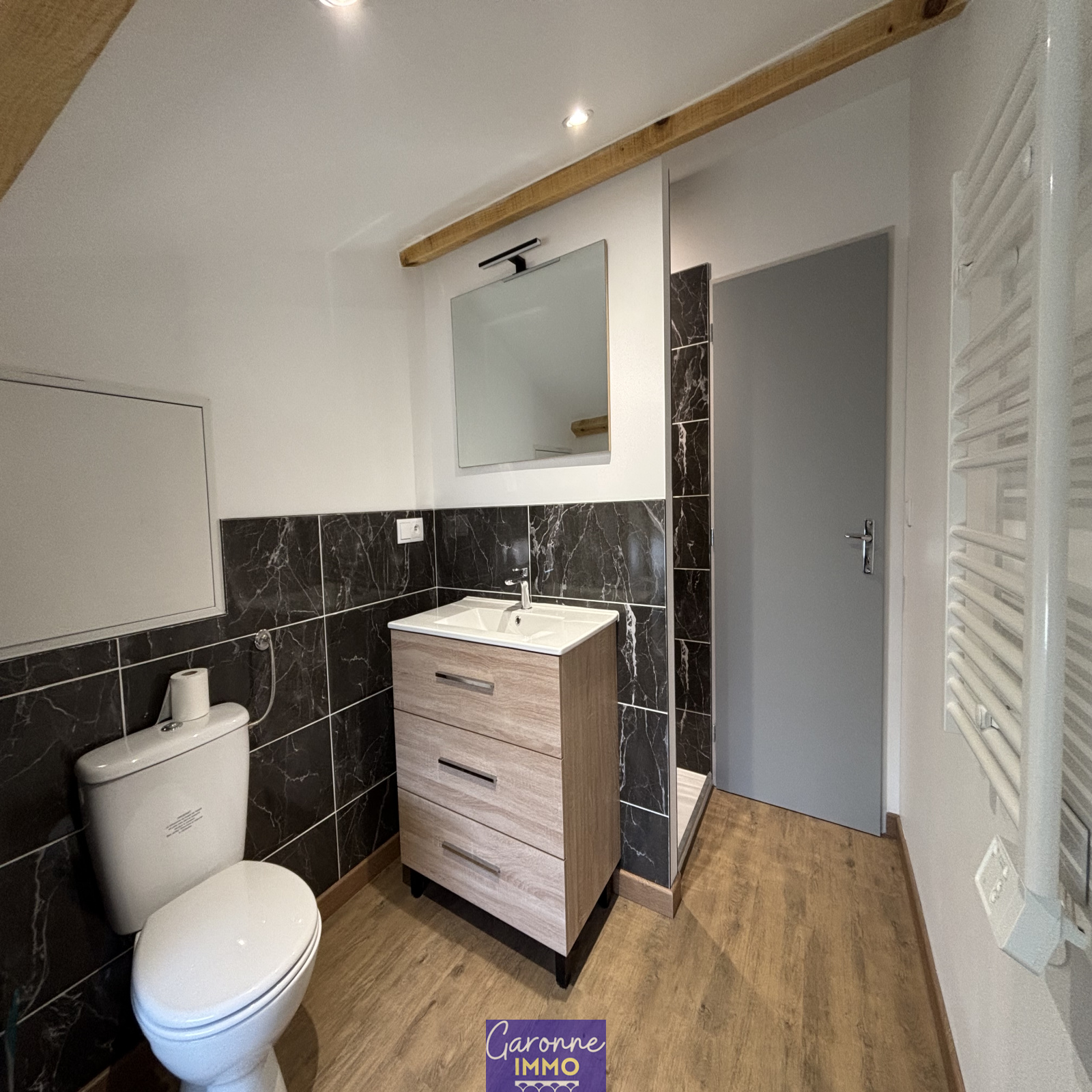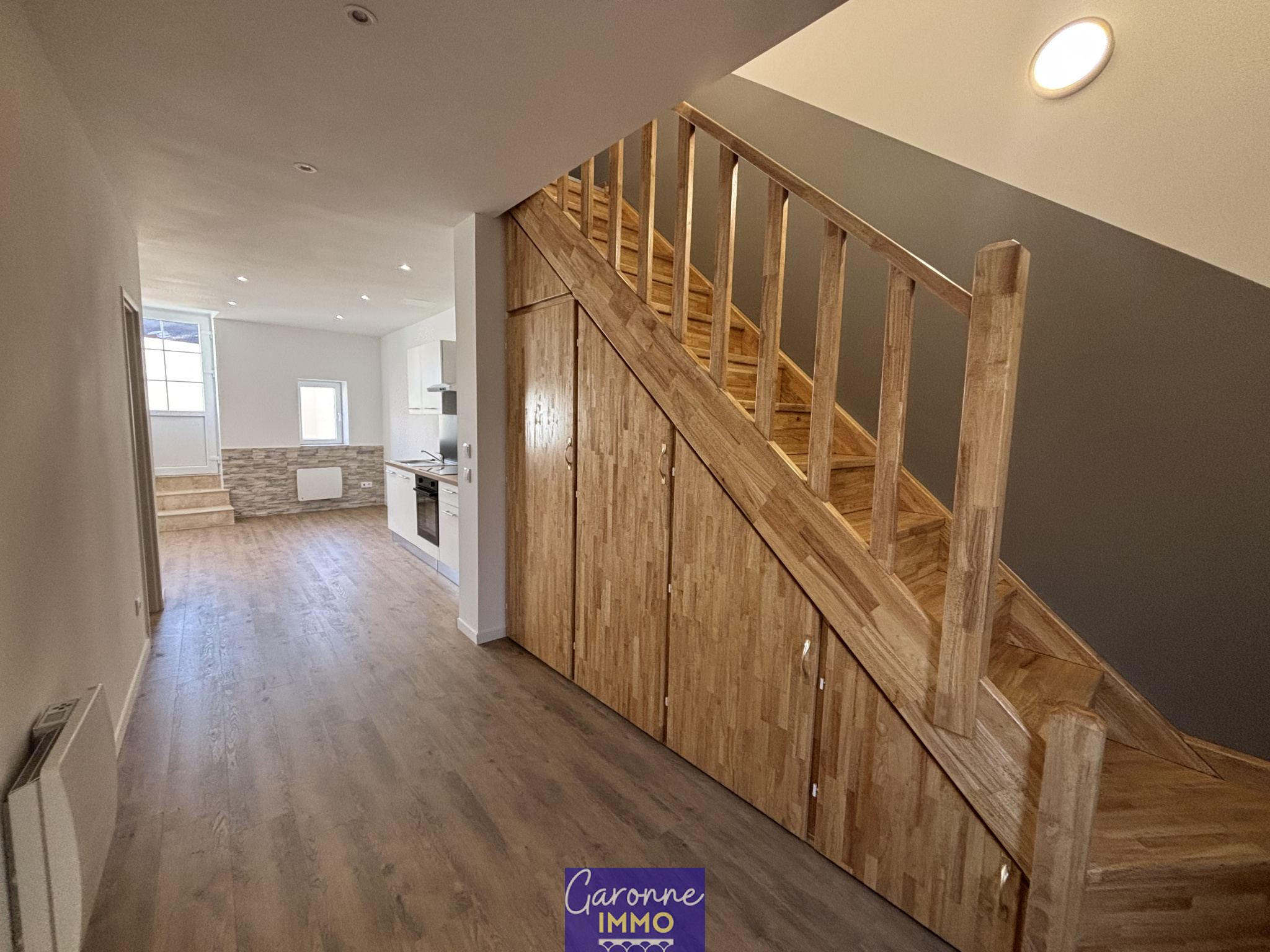 À louer, maison de village entièrement refaite à neuf mitoyenne des deux côtés elle se compose d'une entrée, une pièce de vie avec cuisine ouverte entièrement équipée (hotter, plaque, four, réfrigérateur et lave-vaisselle) et un WC. Sous l'escalier des placards de rangement.