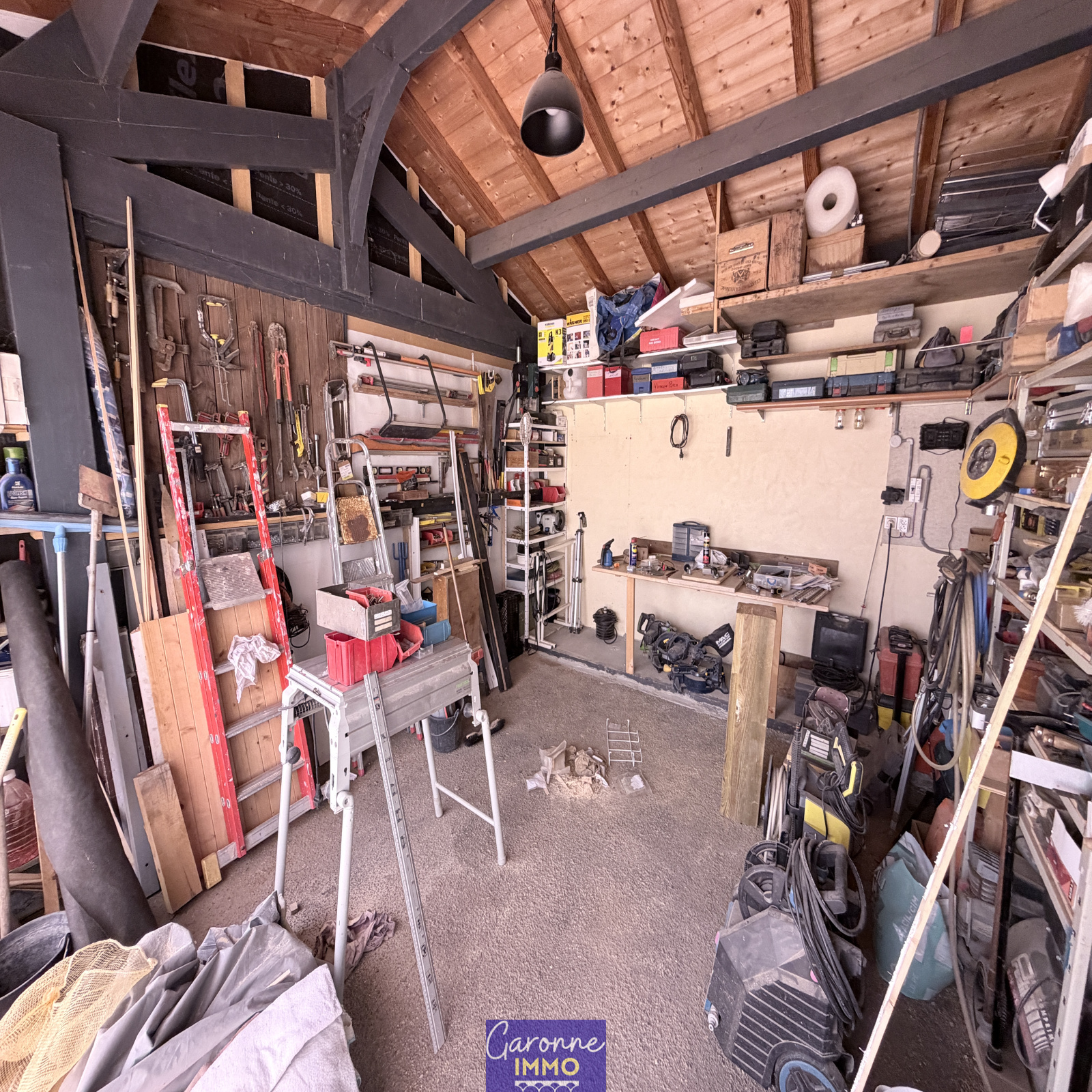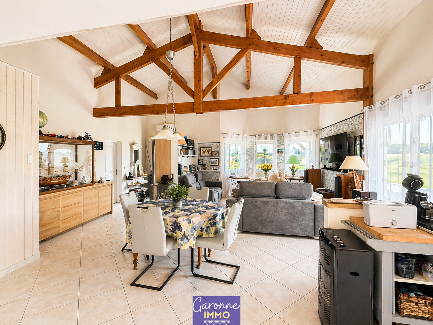Elle dispose d’une entrée ouvrant sur un majestueux salon-séjour de 60 m² avec toit cathédrale et cuisine ouverte entièrement équipée, de 3 chambres, d’une salle d’eau, d’une buanderie, d’un grand cellier, d’un atelier ainsi que d’un garage.