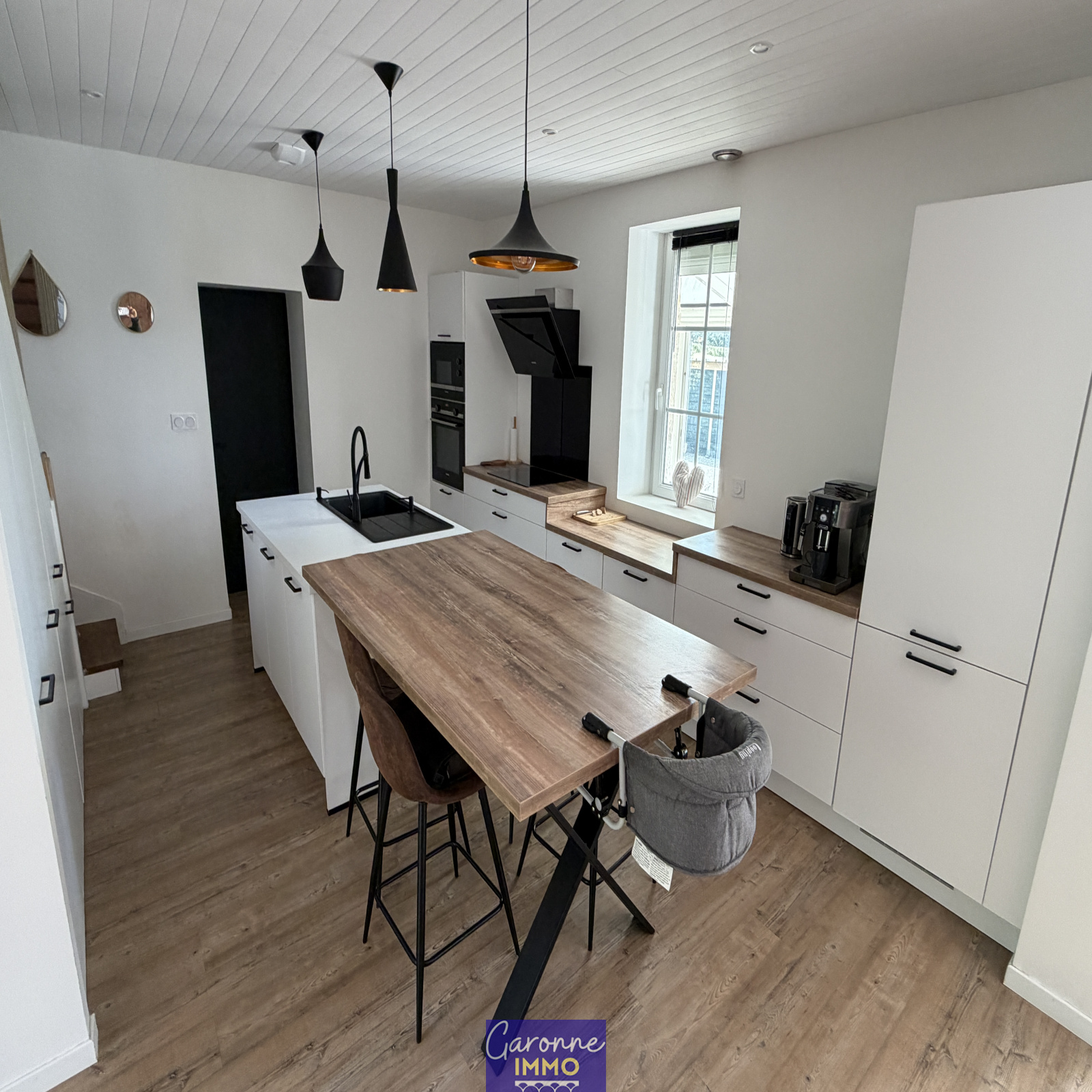Elle comprend en rez-de-chaussée une véranda, une pièce de vie de 40 m² avec cuisine équipée et une suite parentale avec salle d'eau et WC ; à l'étage deux chambres et WC.
