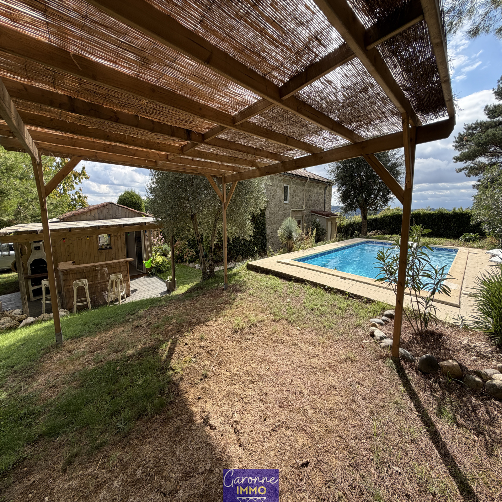 Côté extérieur une cuisine d'été donnant sur une paillotte, piscine 4X8 (avec sanitaire extérieur), nombreuses dépendances (atelier, bucher, abris de jardin) le tout sur un terrain arboré et clos de 1044 m² avec portail électrique.